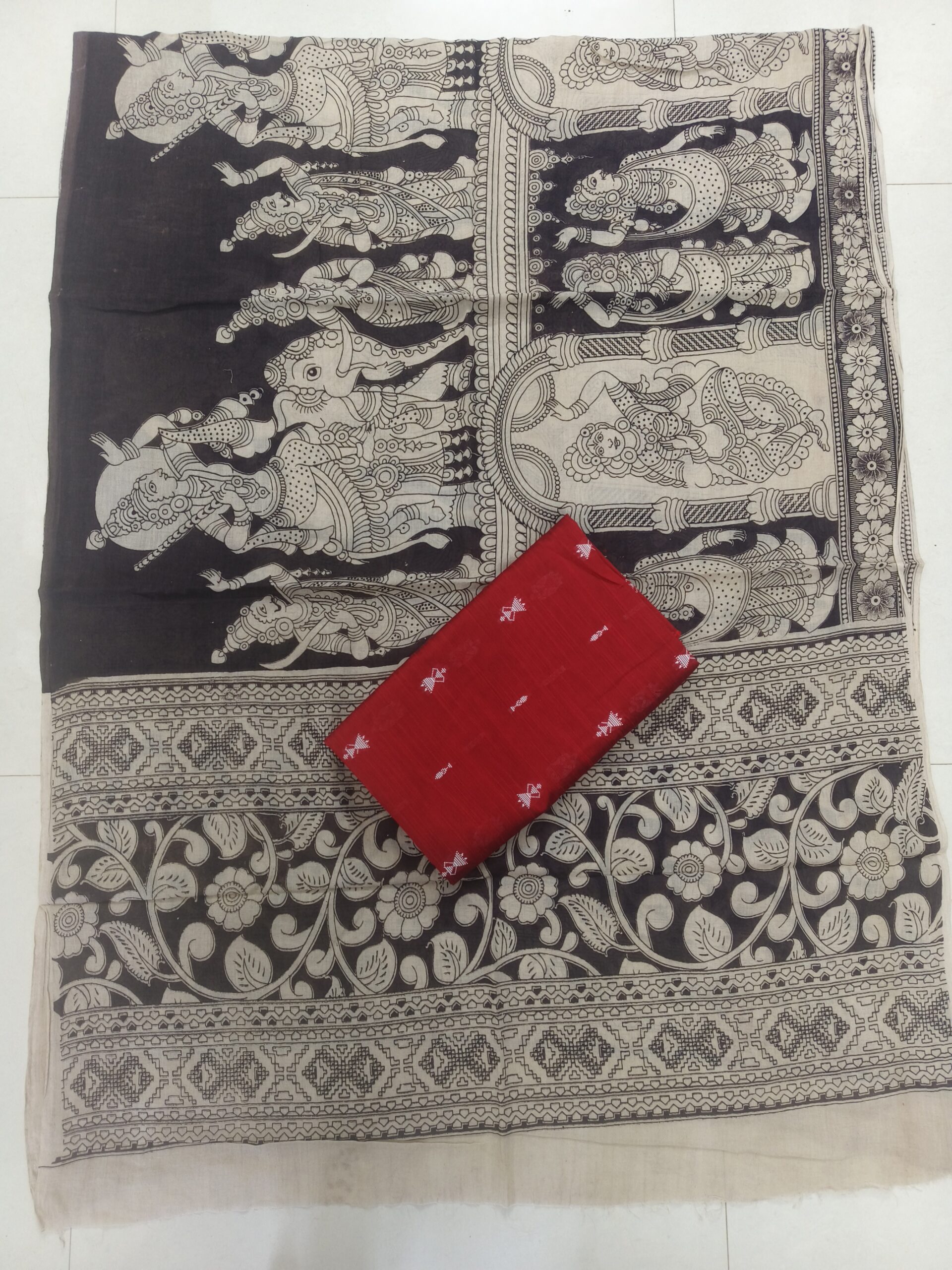The Premium Rawsilk Kalamkari Dupatta Set from Kalamkari Collections brings together classic elegance and artistic tradition. Crafted with premium-quality raw silk for the top and paired with a beautifully printed cotton Kalamkari dupatta, this unstitched 2-piece set offers a graceful ethnic appeal.