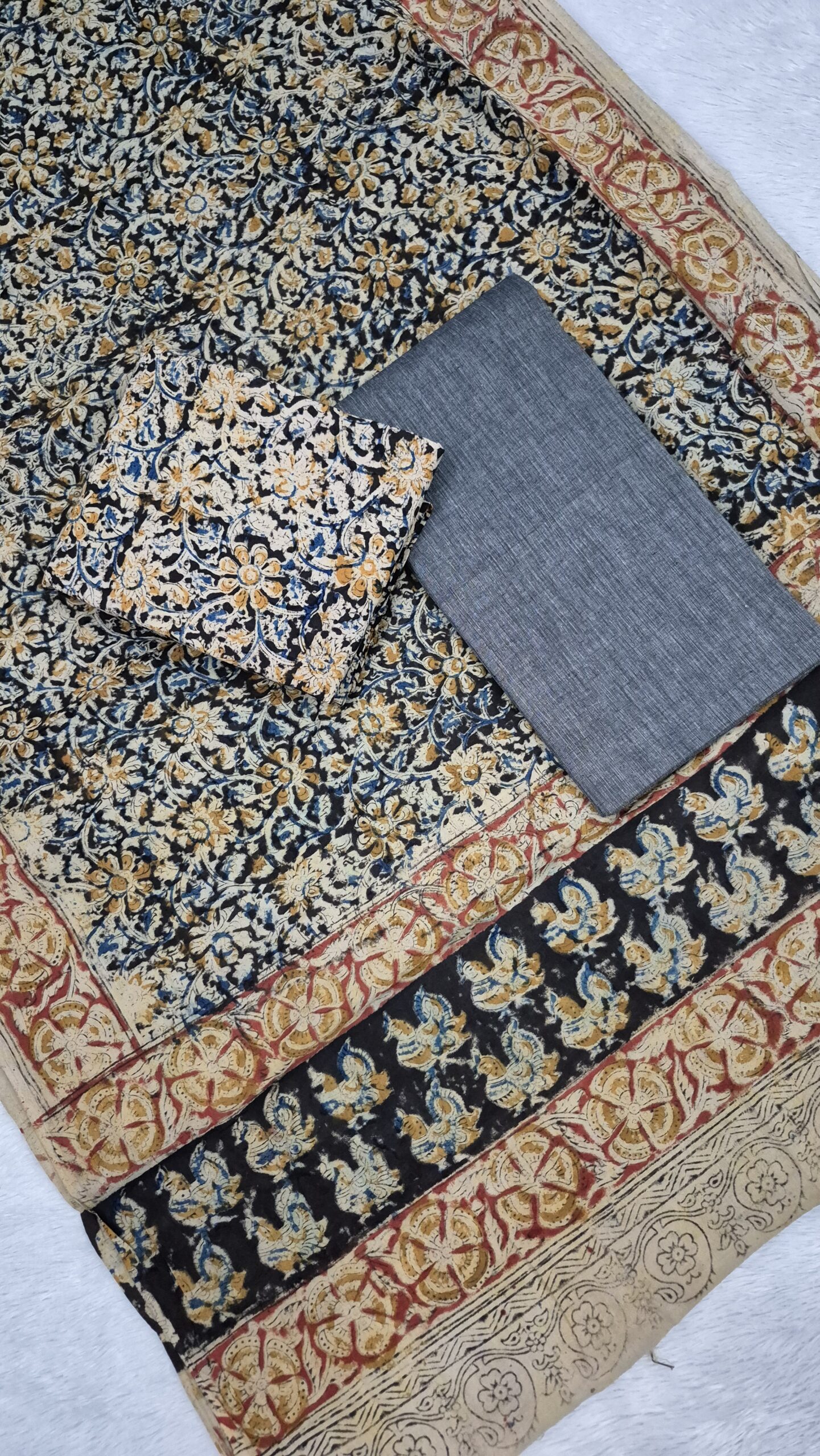 Pure Cotton Elegant Kalamkari Floral Jaal Chudidhar set with Artistic Temple Border | Indigo Blue, Beige & Grey