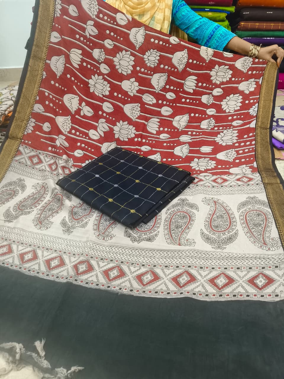 Be the first to review “Traditional Royal Kalamkari Nizam Border Dupatta & Top with Premium Finish | Red & Black”